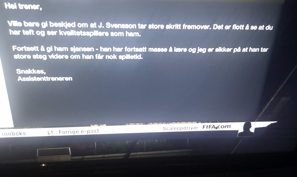 Spilte litt Fifa tidligere i kveld, fikk en ganske morsom melding på skjermen, når vi tenker på omstendighetene rundt Jonas i dag. Måtte ta bilde av det.