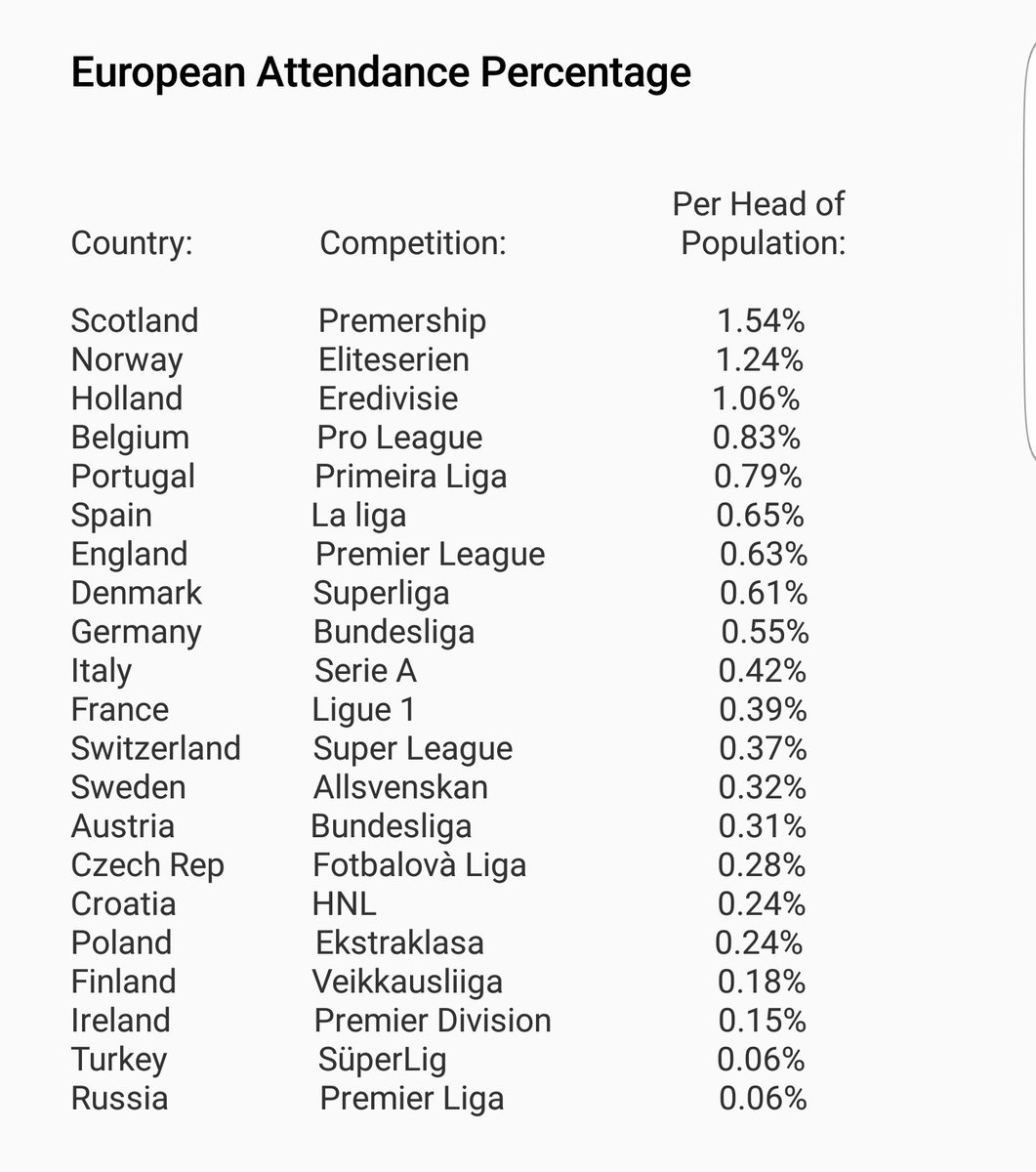 Statistikk kan brukes til så mangt, men det gir nok et skeivt bilde når det ikke hjelper f.eks Russland å fylle fullt samtlige stadioner med 40 000 mann hver helg. Tabellen tar vel heller ikke hensyn til antall lag i ligaen og man burde kanskje tatt med variablene størrelse på stadion og fyllingsfrekveksen.
