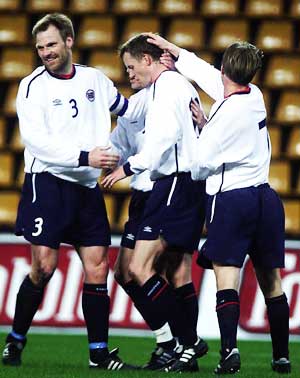 Kampen var veldig bra for Brattigols vedkommende: Han scoret kampens eneste mål og ble dermed matchvinner på Brøndby stadion. På bildet gratuleres han av Hoftun og Winsnes.