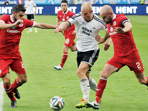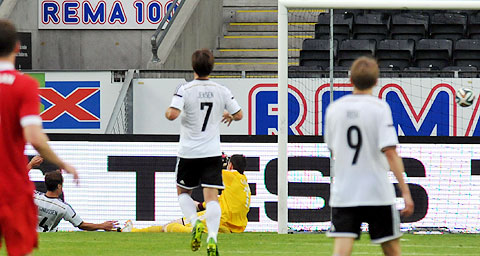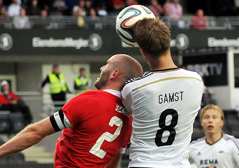 Samme mann ble for liten da Gamst igjen stanget mot mål, men ballen ble stoppet av utespiller på streken.