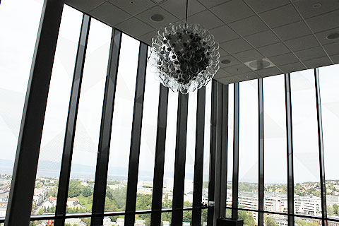 Høyt under taket i 21. etasje, nesten 75 meter over bakken.