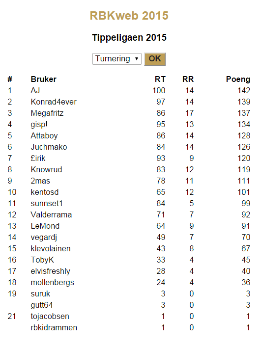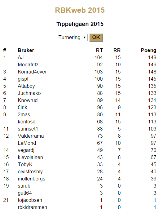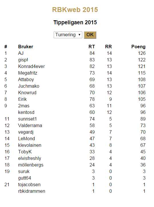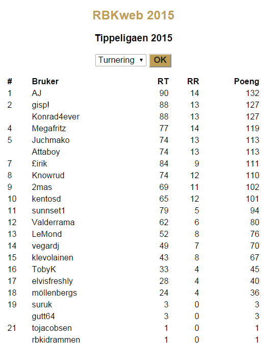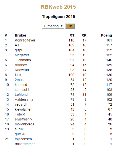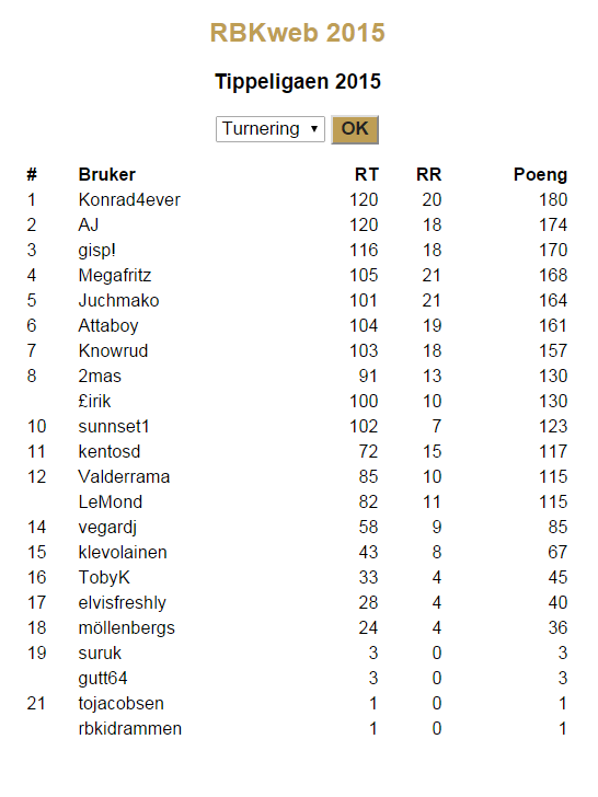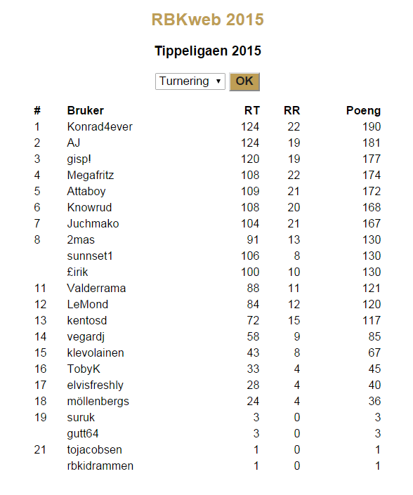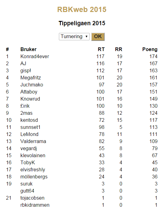Venter på å få postet resultatene fra runde 20 men de har ikke blitt oppdatert. Om noen fra RBK leser her inne så hadde det vært greit om dere tok en titt på det