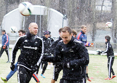 Treninga i snøværet i ettermiddag var mer avslørende enn hovedpersonen når det gjelder laguttaket: Kapteinen og de ni andre utvalgte utespillerne ga seg før keeperne og reservene, deriblant Holmar Eyjolfsson, spilte videre mot hverandre. I stedet blir Stefan Strandberg nygammel makker i midtforsvaret.