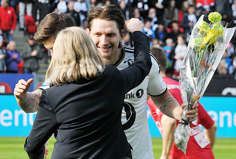 Strandberg rundet 100 RBK-kamper mot Odd, og ble gratulert av Tove Moe Dyrhaug.