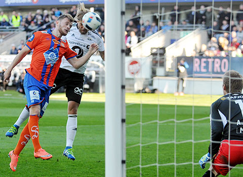 ... Oddbjørn Lie (5) stanset headinga fra finnmarkingen, som fikk kastet fram foten og pirket ballen i mål.