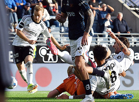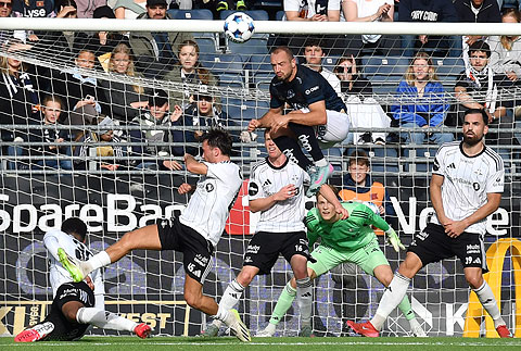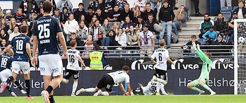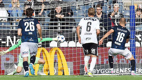 Tangvik fikk ei hånd på skuddet fra Veton Berisha, men ballen spratt i mål.