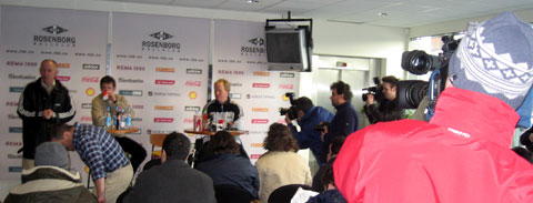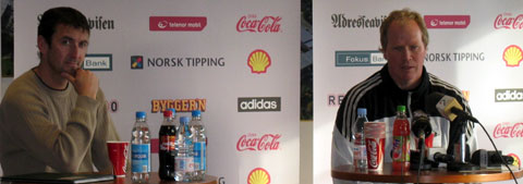 Ola By Rise og assistent Per Joar Hansen gjennomførte første halvdel av pressekonferansen på engelsk. Da man skiftet over til norsk, pakket de portugisiske journalistene sakene sine og gikk. Dermed lettet også trenerduoen litt på sløret.