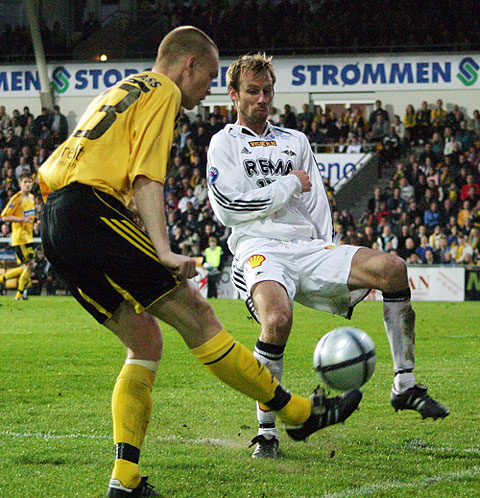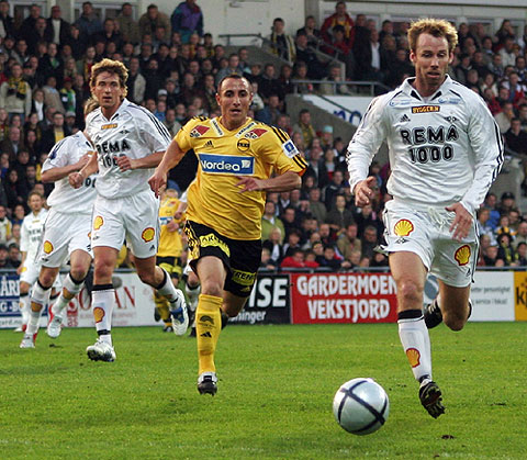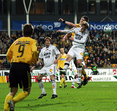 Dagens vondeste: Ørjan med albuen ute av ledd (t.v.), Christoffer Andersson og Solli er hjelpesløse tilskuere. Hoftun skjermer ballen unna Magnus Myklebust (t.h.).