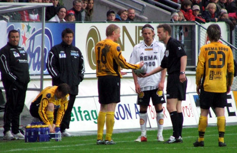 Pussig situasjon: Tom Nordlie sparket til ballen før den hadde gått over sidelinja. Dermed måtte dommer Tommy Skjerven droppe ballen foran Start-benken.