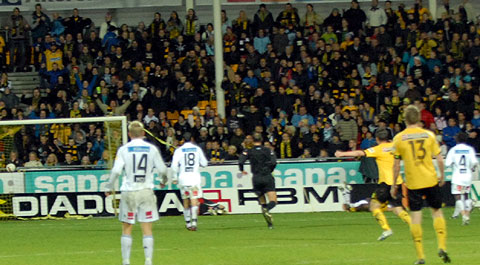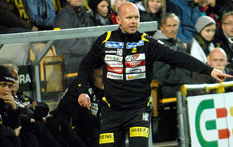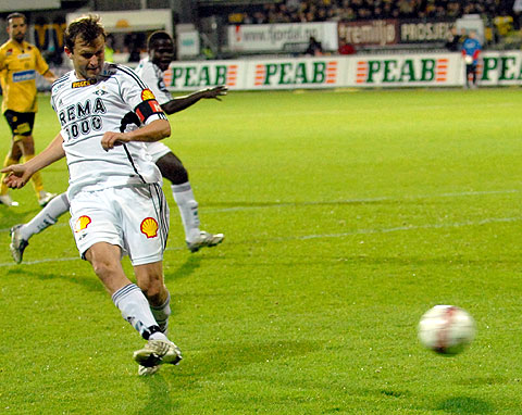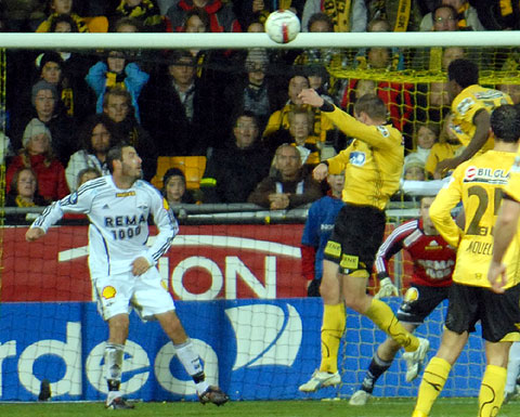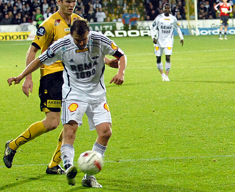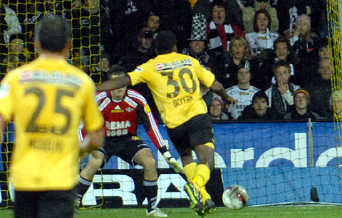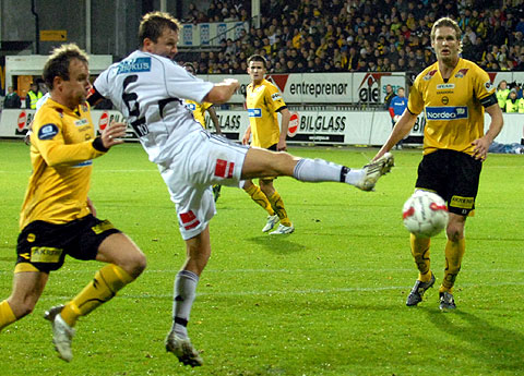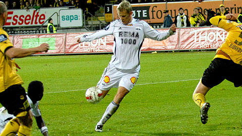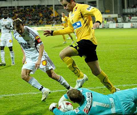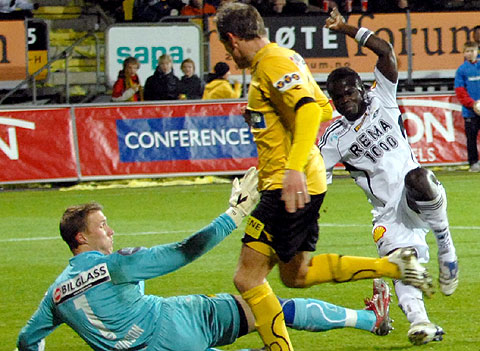 Konan kipper over Fredrikson, men Ståle Stensaas sneik seg bak og reddet.