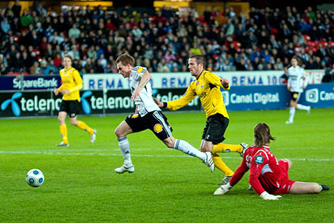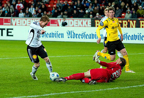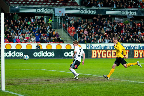 ...men kom for langt utover. Skjelbred fikk ballen, men traff stolpen.
